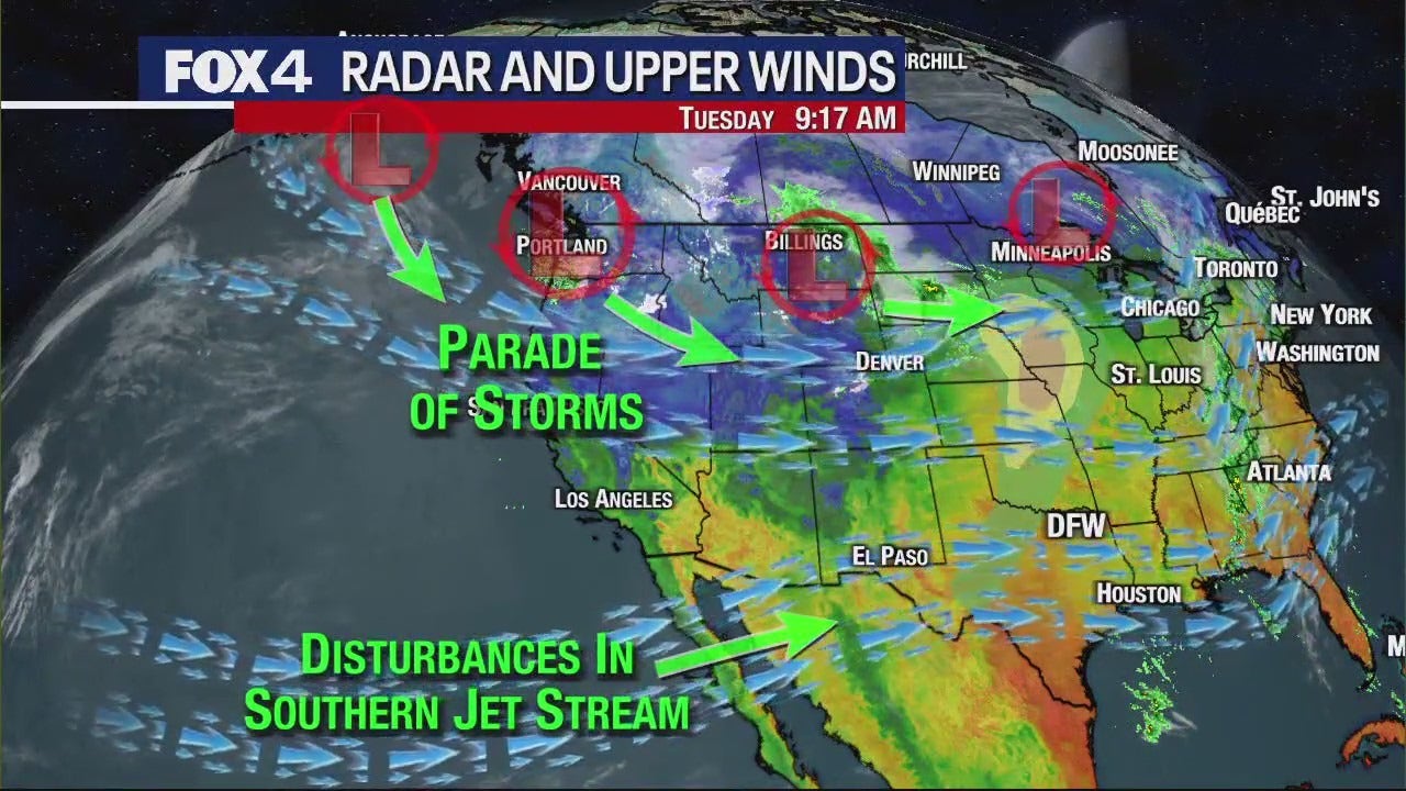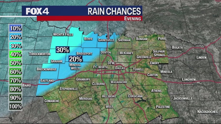 South winds blowing right up I-35 will bring Gulf moisture to North Texas. Temps in the 80s will be widespread with a humid afternoon breeze. Low clouds will break up over the course of the day. A dry line has set up in West Texas, we may see a few storms come in late in the day that make it into our western areas (west of I-35W). While Wichita Falls and Abilene could see thunderstorms and some hail the storms should weaken by the time they reach our area. Coverage doesn't look too high, with only about a 20% chance. Most of us won't see any rain at all!