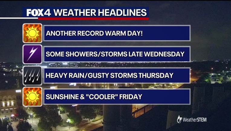 DALLAS - Get ready for a weather whiplash… After Monday's record-tying heat, the Metroplex faces a week of summery temperatures mixed with rounds of rain and storms.