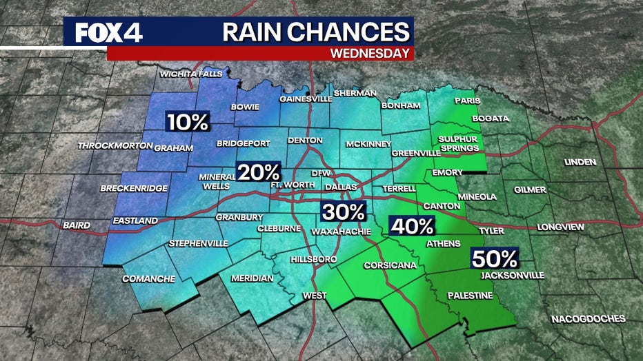 While a few showers are possible late Tuesday night, coverage will increase Wednesday, particularly from the DFW area to the south and east.