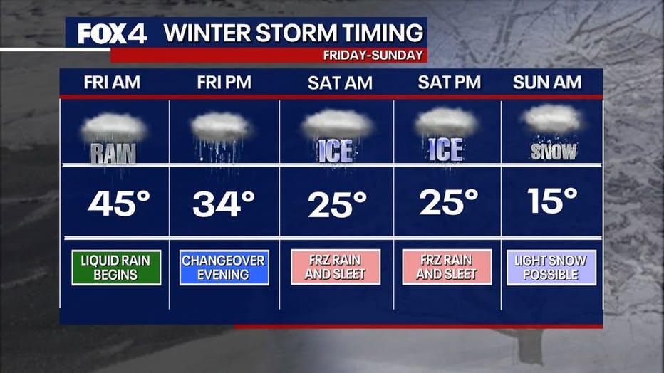 DFW Metroplex: Rain is forecast to begin on Friday night, transitioning into freezing rain after midnight. There will be periods of freezing rain and sleet on Saturday morning and afternoon with heavy sleet at times on Saturday night. It ends as snow on Sunday morning. Significant accumulations of ice (freezing rain/sleet) are expected with minor snow accumulations too.