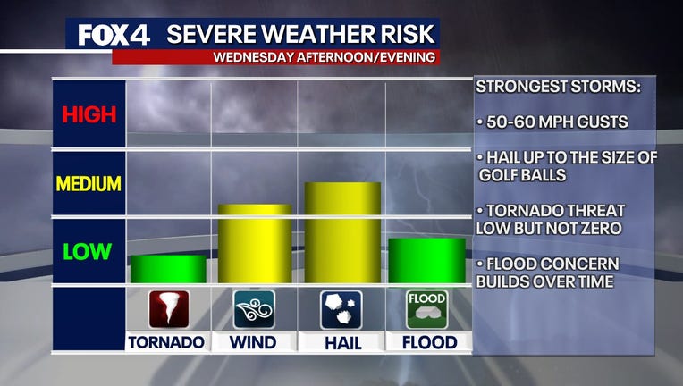 The main concerns for Wednesday are wind gusts between 50 and 60 mph and hail roughly the size of quarters. While the tornado potential remains low, it cannot be ruled out. Some isolated gusts could reach up to 65 mph.