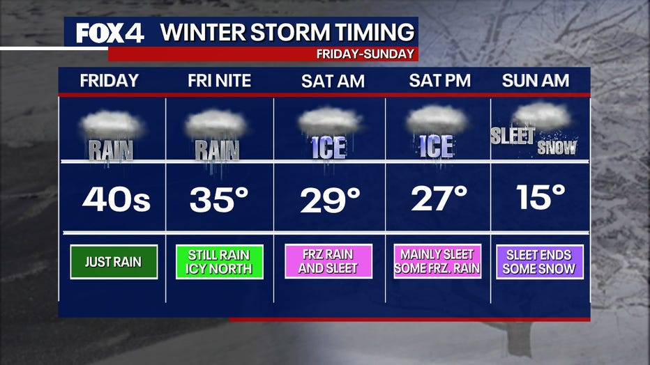 North of DFW (Sherman, Paris, Graham): Rain and ice are expected Friday night, transitioning to sleet and snow on Saturday. Freezing rain and sleet are expected to begin accumulating around 6 p.m. Friday.