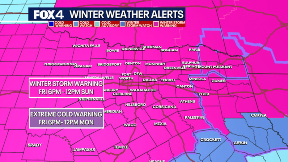 The National Weather Service has issued a Winter Storm Warning for North and Central Texas, effective from 6 p.m. Friday through noon Sunday. Additionally, an Extreme Cold Warning will be in effect from Saturday evening through Monday morning.