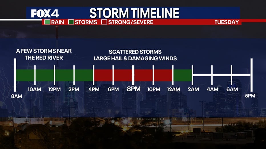 According to the FOX 4 Weather team, the timeline has not changed. People should stay weather aware beginning in the early afternoon as storms redevelop to the north and then around the rush hour for the Metroplex.