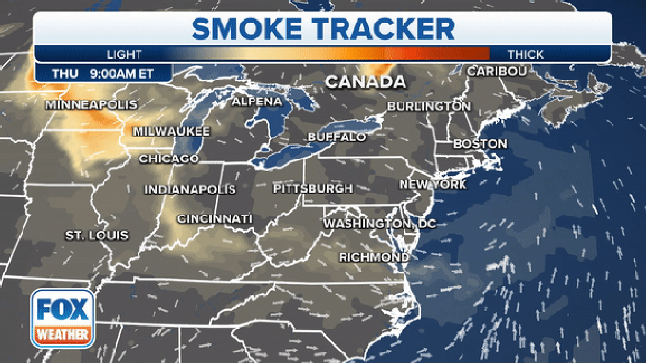 The culprit was spotted Thursday as northerly winds drove wildfire smoke in Canada down into the Upper Midwest. Forecast models suggest it could now swing back into the Great Lakes and Northeast by Friday, according to the FOX Forecast Center.